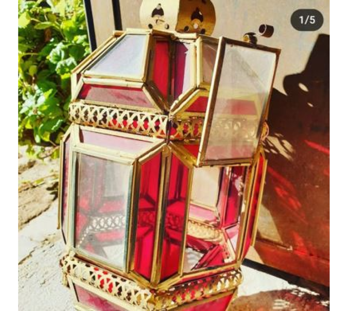 Farol de inspiración árabe con detalles dorados y vidrio rojo. Una pieza que combina diseño exótico y funcionalidad decorativa.