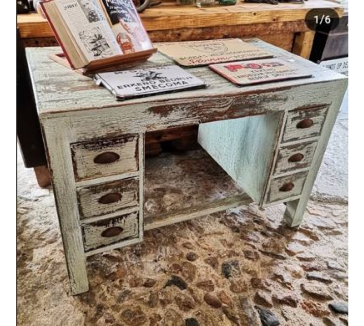 Escritorio rústico con acabados desgastados y múltiples cajones, perfecto para un ambiente clásico o vintage.